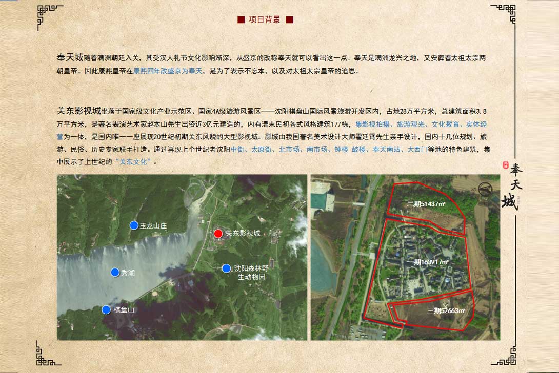 關(guān)東影視城坐落于國(guó)家級(jí)文化產(chǎn)業(yè)示范區(qū)、國(guó)家4A級(jí)旅游風(fēng)景區(qū)——沈陽(yáng)棋盤(pán)山國(guó)際風(fēng)景旅游開(kāi)發(fā)區(qū)內(nèi),占地28萬(wàn)平方米,總建筑面積3.8萬(wàn)平方米,是著名表演藝術(shù)家趙本山先生出資近3億元建造的,內(nèi)有清末民初各式風(fēng)格建筑177棟,集影視拍攝、旅游觀(guān)光、文化教育、實(shí)體經(jīng)營(yíng)為一體,是國(guó)內(nèi)唯一一座展現(xiàn)20世紀(jì)初期關(guān)東風(fēng)貌的大型影視城。影城由我國(guó)著名美術(shù)設(shè)計(jì)大師霍廷霄先生親手設(shè)計(jì),國(guó)內(nèi)十幾位規(guī)劃、旅游、民俗、歷史專(zhuān)家聯(lián)手打造。通過(guò)再現(xiàn)上個(gè)世紀(jì)老沈陽(yáng)中街、太原街、北市場(chǎng)、南市場(chǎng)、鐘樓 鼓樓、奉天南站、大西門(mén)等地的特色建筑,集中展示了上世紀(jì)的“關(guān)東文化”。