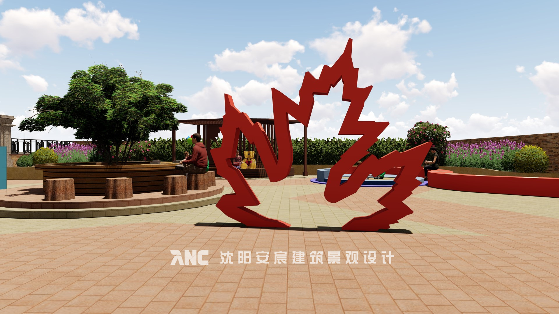 景觀營造以童趣的設計手法,增色小熊特色景觀小品,應用墻體綠化做軟景的營造,適當點綴水景,添加空間的靈動性,出顯歡樂一家人的主題氛圍。