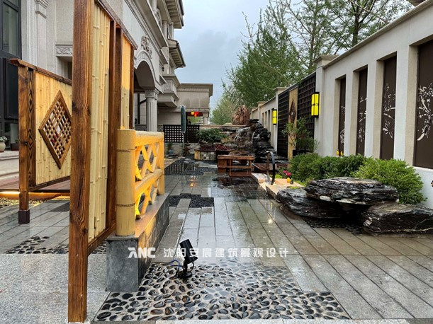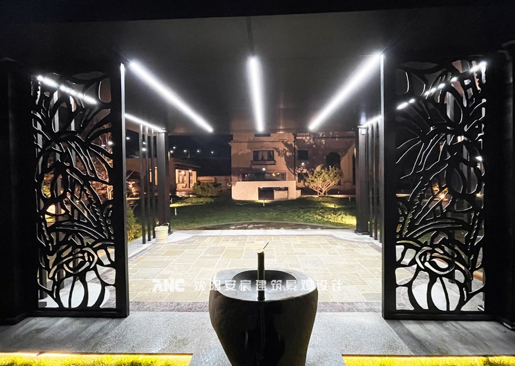 庭院位于山林之中,為保留原有自然風(fēng)貌,設(shè)計師利用其綠化與地形優(yōu)勢,減少硬質(zhì)鋪裝面積,大面積設(shè)置綠化,使庭院與自然完美結(jié)合。渾然天成——取之自然、用之生活