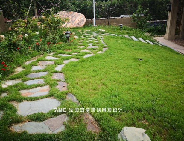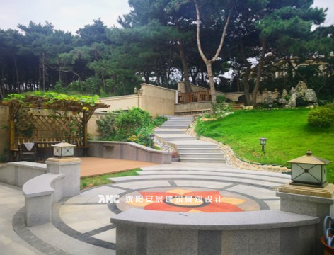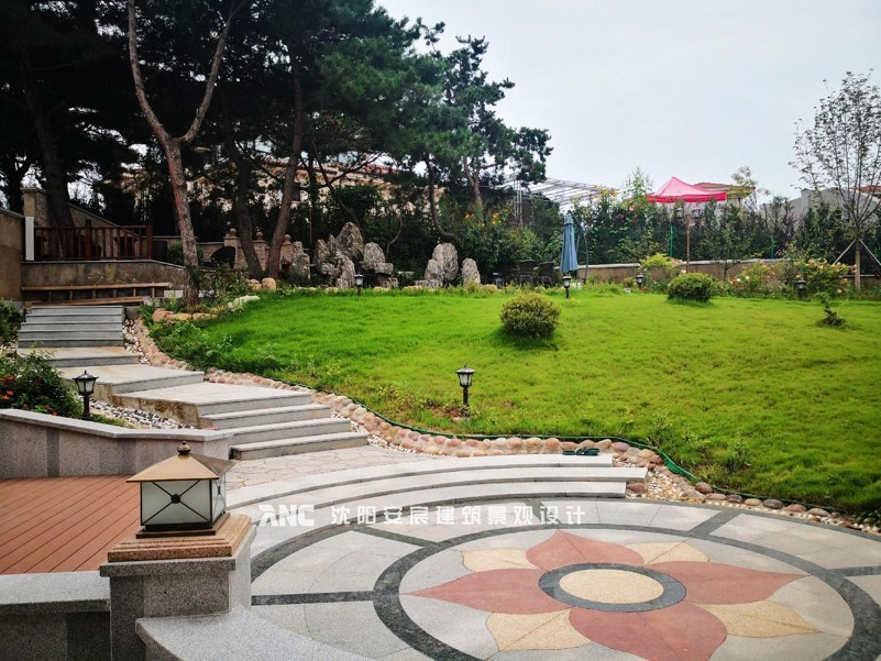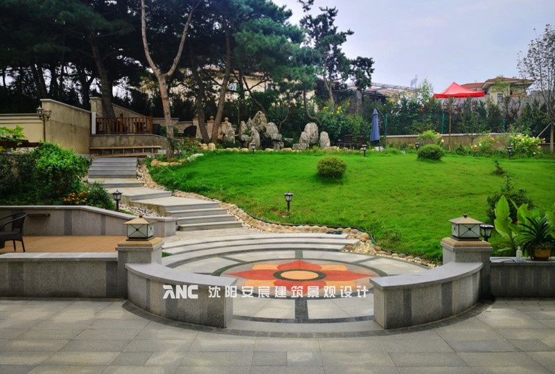 利用景墻劃分出圓形廣場(chǎng),廣場(chǎng)地面做水刀拼花,美觀、大氣。預(yù)留的廣場(chǎng)區(qū)可做戶外就餐區(qū),或兒童游樂(lè)區(qū)等。大面積草坪使視野足夠明亮。