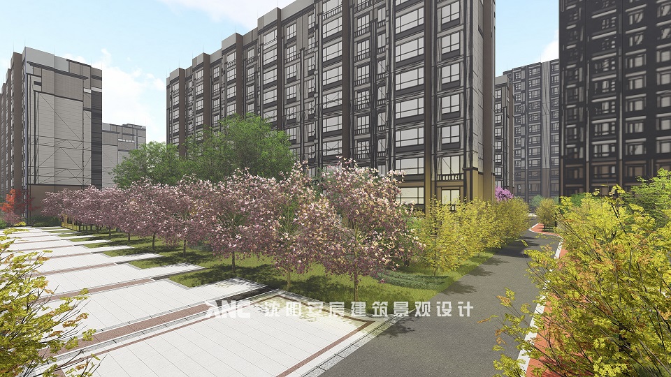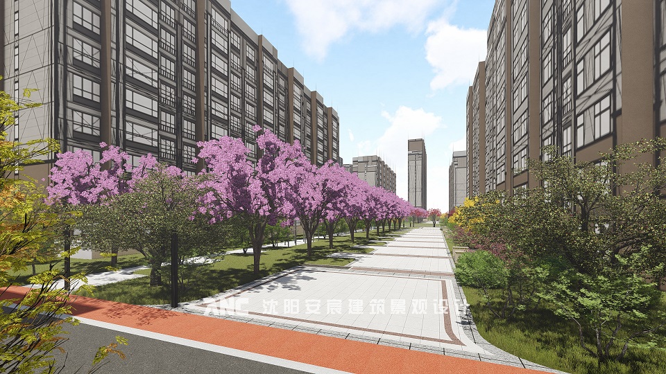 兩側(cè)以組團(tuán)形式增加飽滿度,搭配檜柏球、山楂、丁香、山杏、山桃丁香等植物。植物環(huán)島以叢生元寶楓做為點(diǎn)景樹,下層搭配小葉黃楊和紫葉李籬。整體注重層次、色彩、及品種高低搭配來營造幻彩四季的景觀空間。